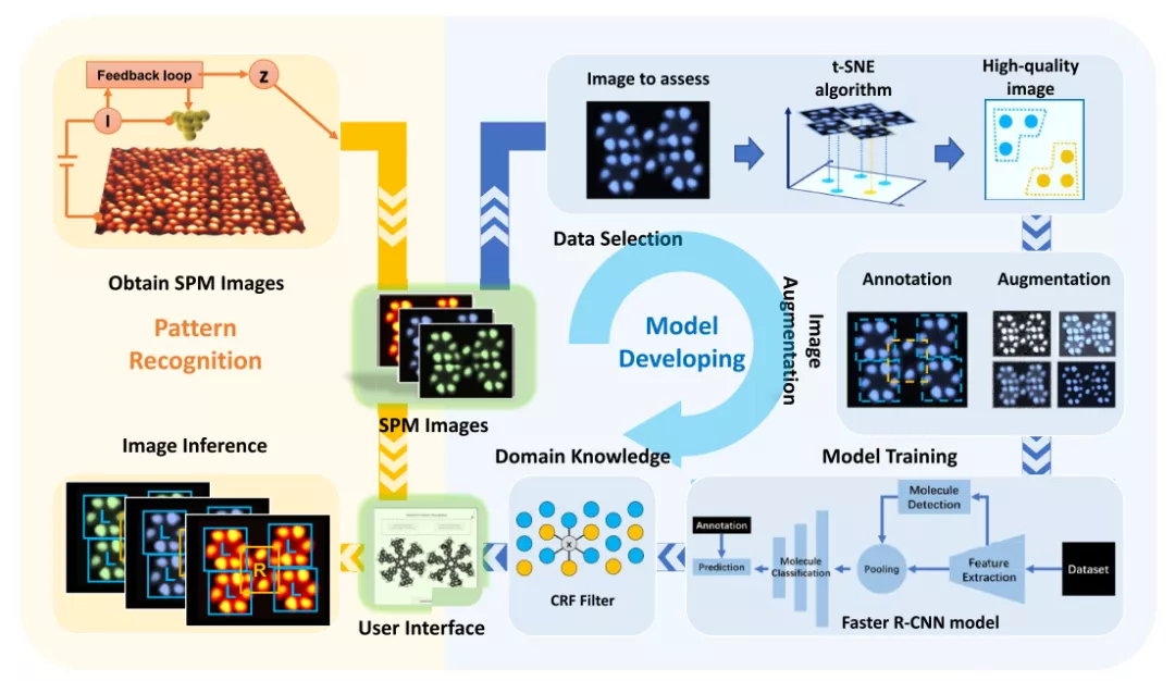 在 STM 实验中,深度学习框架支持高效自动化分析工具,单个 STM 图像的识别率可以超过 90%,但应用时仍然需要为不同的任务和分子系统训练单独的模型。如果具有大量通用的训练数据,有望训练出一个可以应用于 SPM 成像的不同任务和分子系统的通用模型。