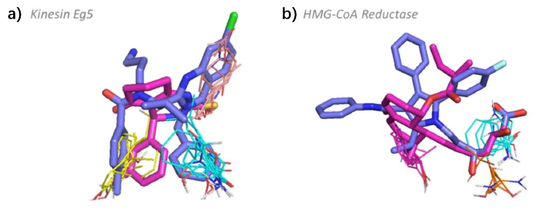 驱动蛋白Eg5有3个结合热点,它们在相当深的口袋中紧紧相邻。28个配体中,每个配体都与结合位点的3个热点结合,分子量在274到517Da之间,且pBA和MW之间存在正相关关系。临床候选药物ispinesib是bRo5配体,与热点的重叠相比其他配体更强,更深地进入结合口袋,并与腔壁作用从而产生更高的结合亲和力。