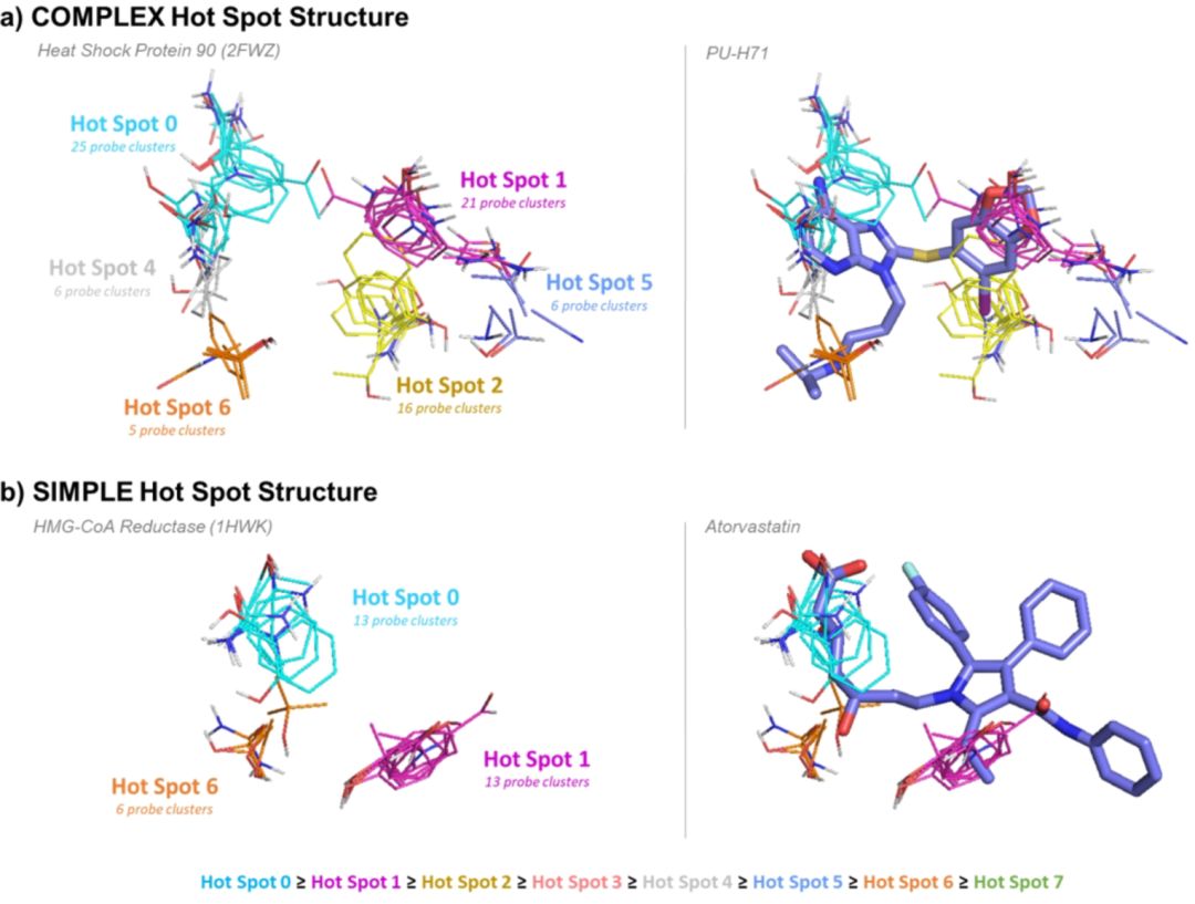 图1. 由FTmap确定的复杂与简单的结合位点热点结构示例