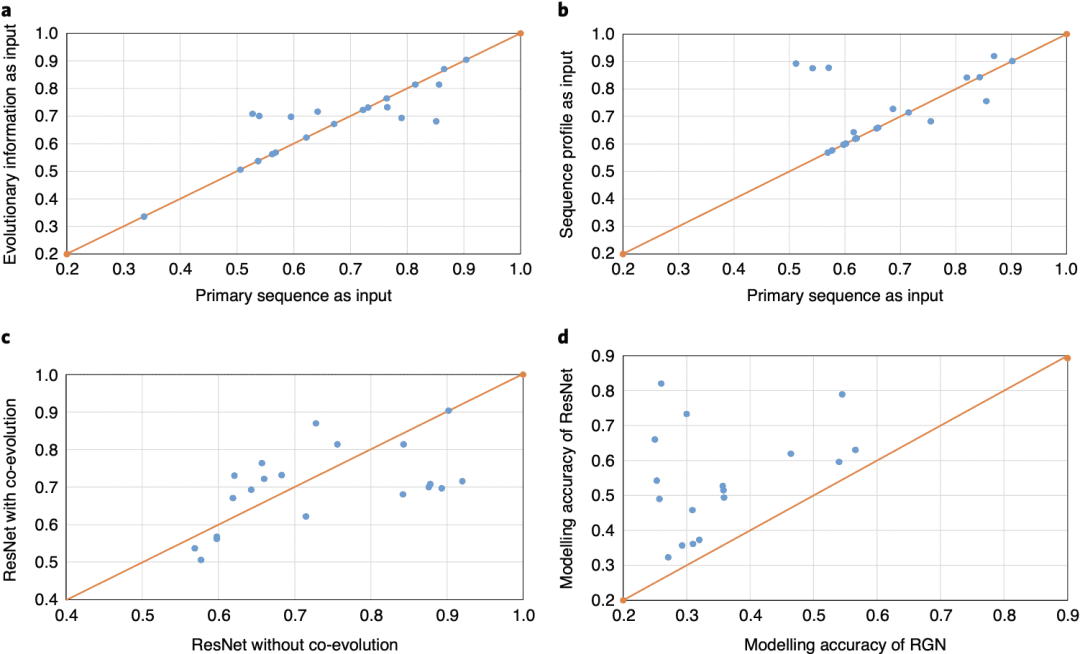 在这里,本文总结和分析了没有使用共同进化的ResNet如何预测32个CASP13 FM靶点和21个人类设计的蛋白质的结构。没有共进化信息的CASP13 FM靶模型。ResNet生成的第一和最佳三维模型的平均质量(TMscore)分别为0.478和0.506。当考虑到最佳预测模型时,ResNet预测了32个CASP13 FM目标中的18个的正确折叠。图2c显示了建模精度和目标-训练结构相似性之间的弱相关性(相关系数=0.363,趋势线R=0.1315)。建模精度与MSA深度(相关系数=0.211,趋势线R=0.0448)之间的相关性比使用共进化时弱,这并不意外。为了让读者更好地理解本文的工作,作者将其与顶级服务器Robetta和RGN进行了比较。Robetta是CASP13中最好的服务器,它没有使用深度学习。它结合了基于模板的建模、从头计算和基于共进化的接触预测。RGN是一种端到端的深度学习方法,它可以从序列中预测蛋白质结构,而不是共进化。Robetta提交的32个CASP13 FM目标的first和best模型的平均核心值分别为0.390和0.430。RGN模型的平均核数为0.251。Robetta和RGN都比本文的方法差很多。此外,对于几乎所有32个FM目标,ResNet在没有共进化信息的情况下训练预测出比RGN质量更好的3D模型。RGN无法预测所有32个测试目标的正确折叠结构,而Robetta和ResNet则只是分别预测了7个和15个正确折叠,即使只考虑第一模型。模拟人类设计的蛋白质。ResNet可以预测18种设计蛋白质中16种的正确折叠结构。当进化信息完全不可用时,ResNet仍然可以预测几乎所有21种蛋白质的正确折叠结构。由RGN生成的21个模型的平均TMscore为0.363,比没有共同进化和使用原始序列作为输入的ResNet训练的要差得多。总的来说,RGN只预测了三种人类设计的蛋白质的正确折叠,而ResNet只预测了14种人类设计的蛋白质的正确折叠。Yang等人测试了21种人类设计的蛋白质中的11种。trRosetta预测的3D模型的平均TMscore为0.661,与使用共进化训练的ResNet相当,这并不奇怪,因为trRosetta也使用共进化训练。