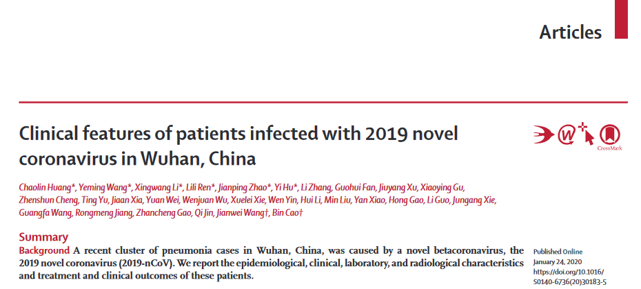 2020年1月24日,柳叶刀在线发表有关2019新型冠状病毒研究的论文,《柳叶刀》及《柳叶刀-感染病学》同时推出“冠状病毒”专题(https://www.thelancet.com/coronavirus),包括两篇原创研究论文、两篇评论及一篇社论。北京中日友好医院曹彬及北京协和医院王建伟共同通讯的文章“Clinical features of patients infected with 2019 novel coronavirus in Wuhan, China”, 文章统计了截至2020年1月2日确诊感染新型冠状病毒的41例患者的临床信息。